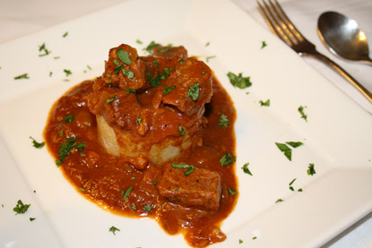 Again, we find ourselves back to the question of what it might go best with. In Europe it is most often served with a potato dumpling, and when done right that dumpling is a killer. The Hungarians seem to favor csipetke, a noodle (about the size of a bean) made very simply with eggs, salt and flour. I could make an argument for a wide pasta as a good choice and rice might do in a fix, too, but I have to admit my friend Malcolm was right. Grits seem to make the best connection. The grits will absorb some of the sauce, but will not become too runny unless you take all day to eat it. Grits are pretty simple to make and can be poured into artful forms and make for great presentation.
